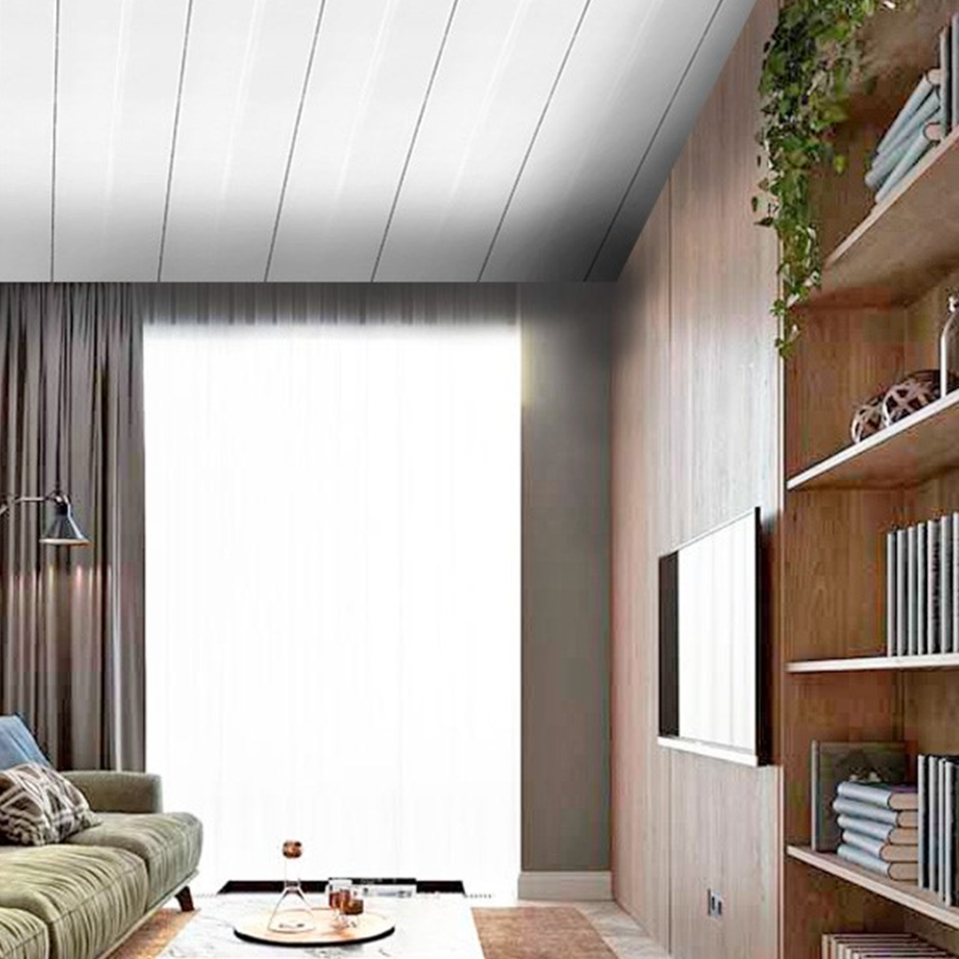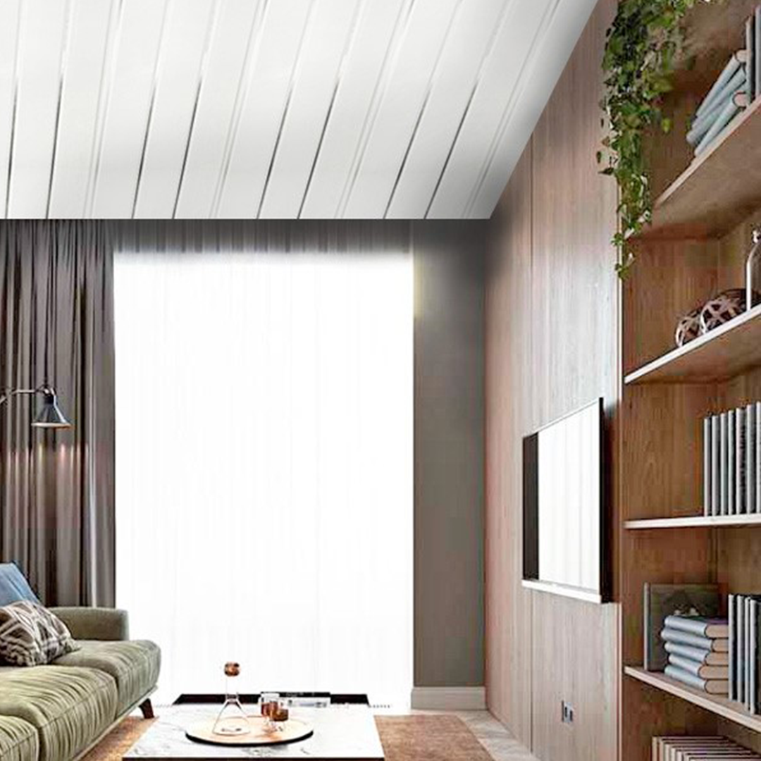 Cielo raso de PVC con ligero detalle uniforme, resistente a la humedad. Elegancia y practicidad en un formato liviano y fácil de instalar.