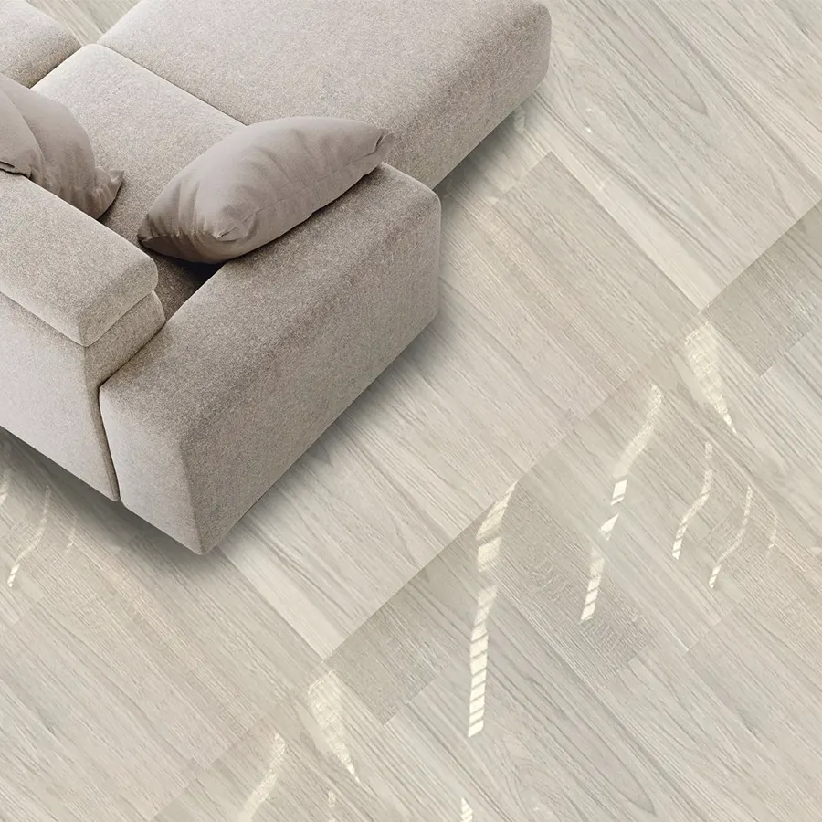Porcelanato con diseño tipo madera en tonos beige y café dispuesto en un patrón entrelazado que aporta calidez.
