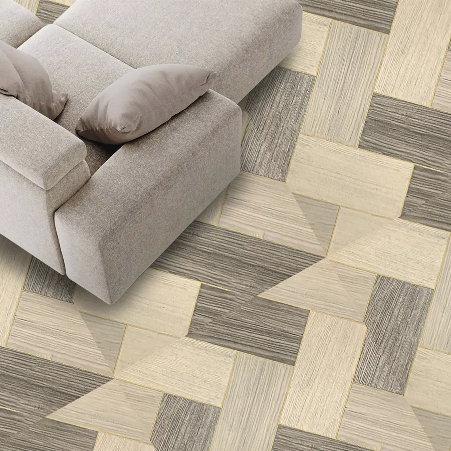 Porcelanato de estilo geométrico con efecto texturado compuesto por triángulos en tonos arena y gris que forman una estrella central.