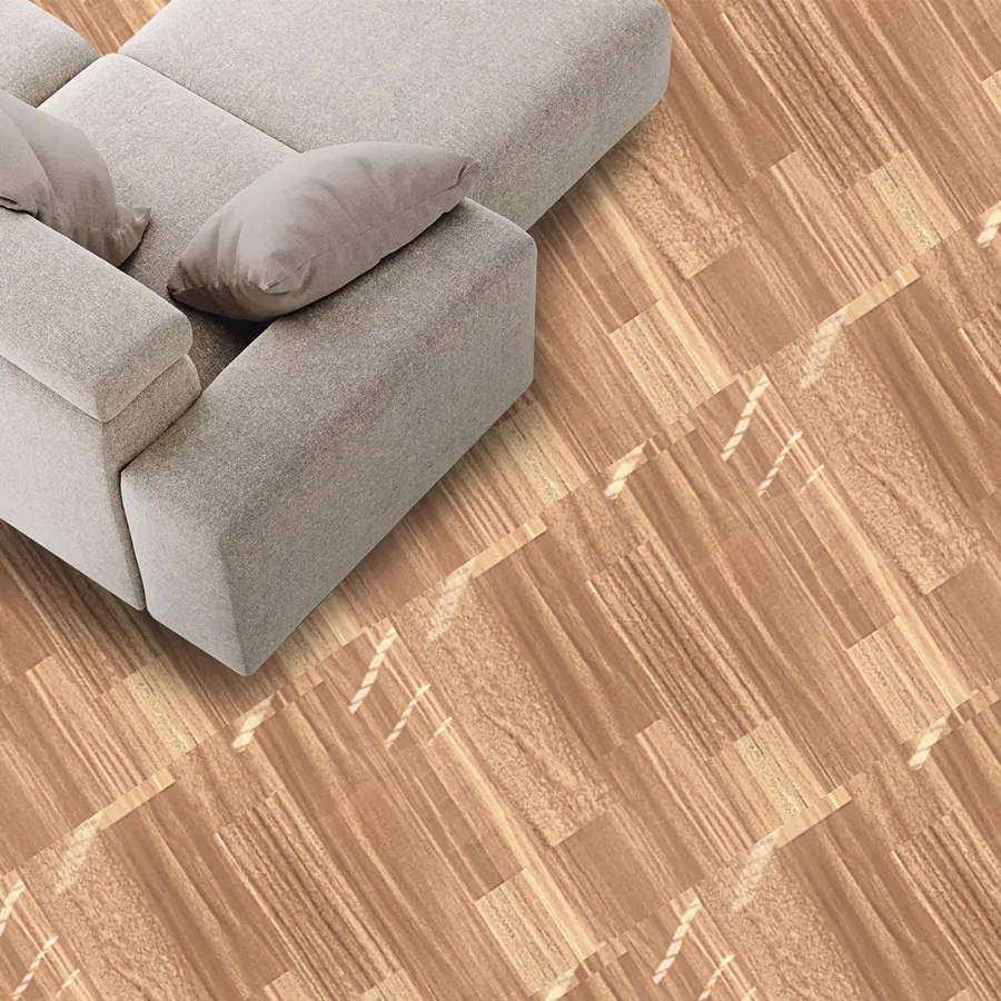 Porcelanato con diseño tipo madera en tonos cálidos dispuestos en un patrón entrelazado aportando calidez a los ambientes