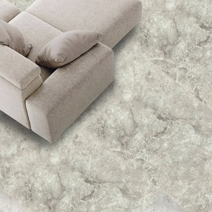Porcelanato gris claro con vetas sutiles, que imita el mármol, ofreciendo un acabado elegante y moderno.