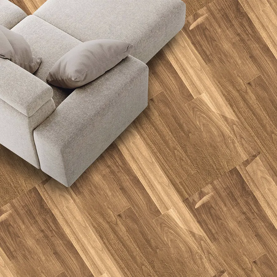 Porcelanato efecto madera en tono nogal, con sutiles patrones que brindan calidez y carácter sofisticado a los ambientes.