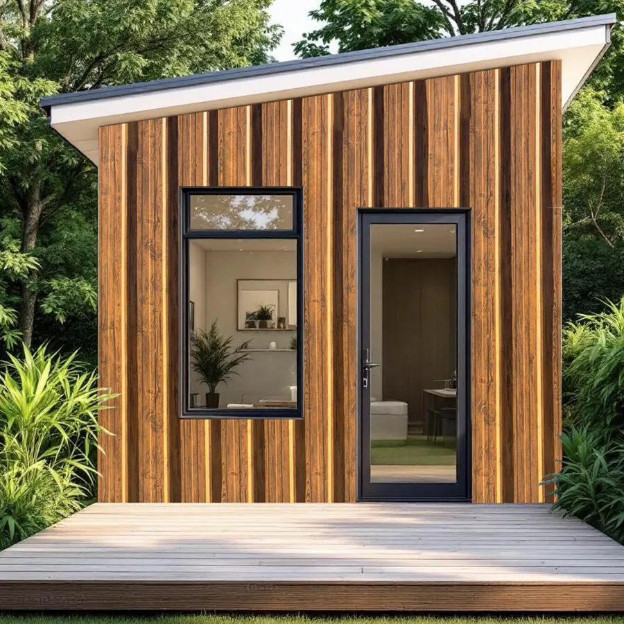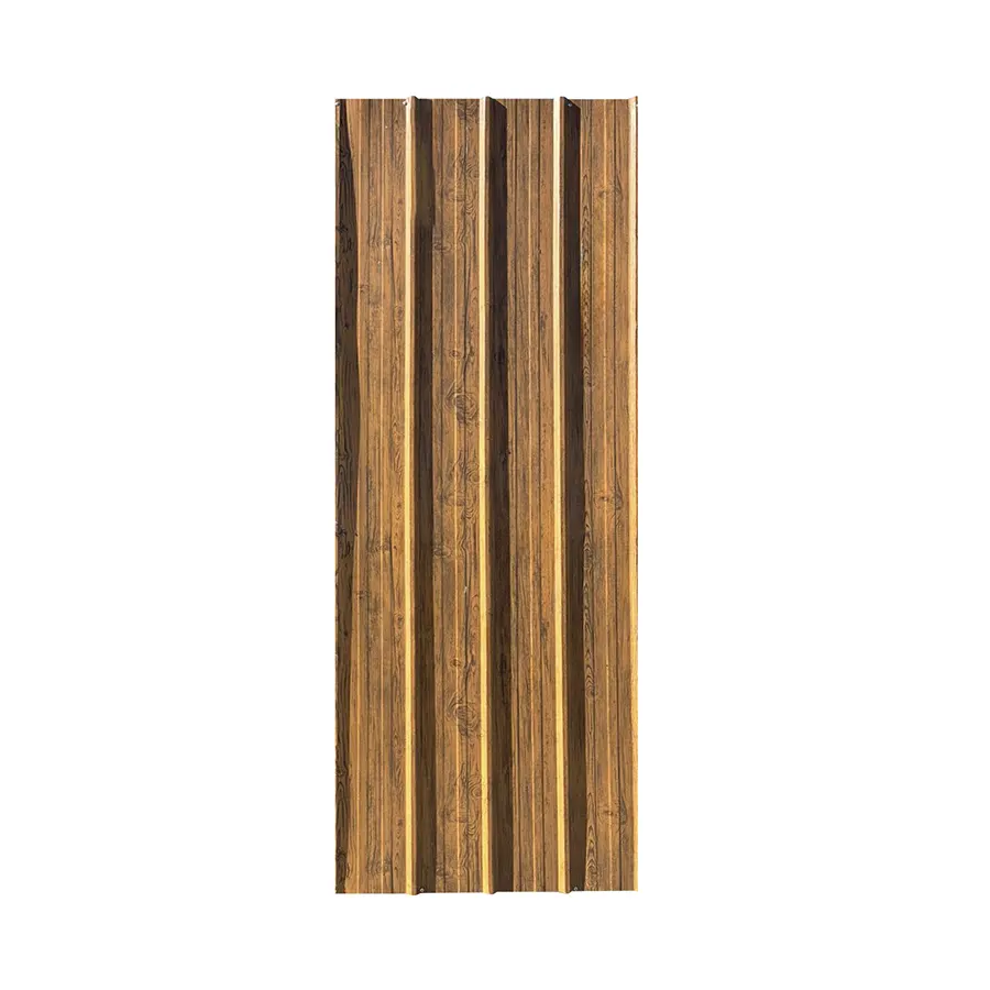 Plancha de zinc con acabado que imita madera, con vetas verticales y un tono cálido que le da un aspecto rústico.