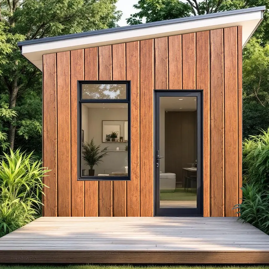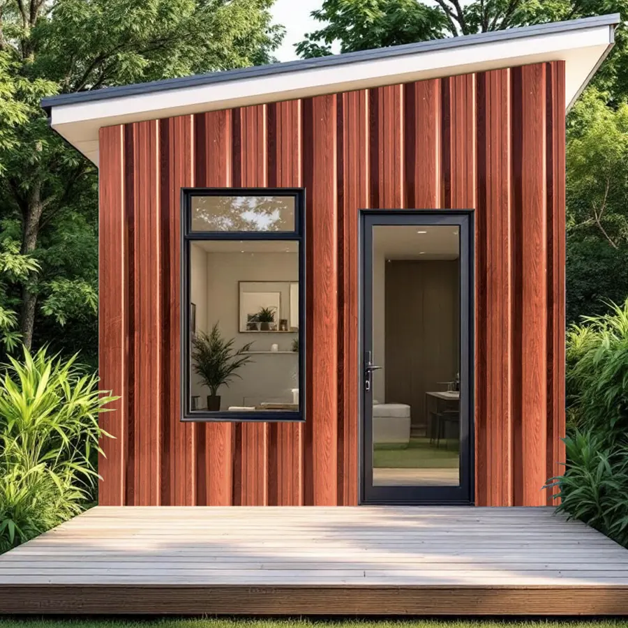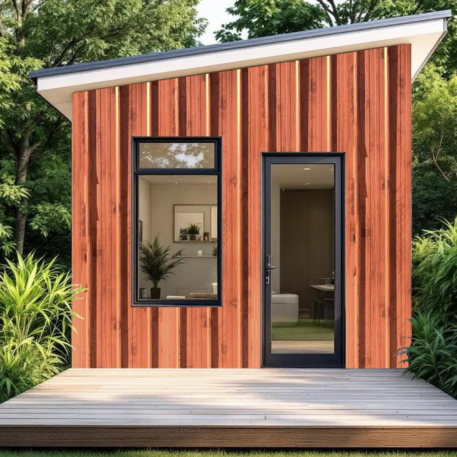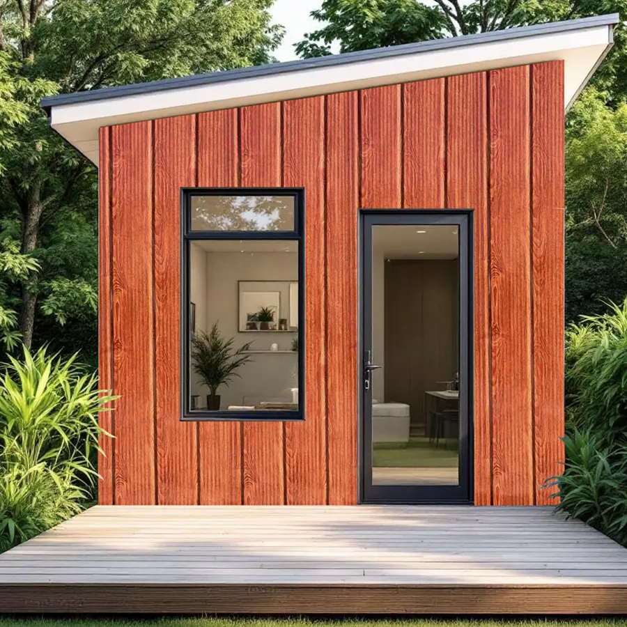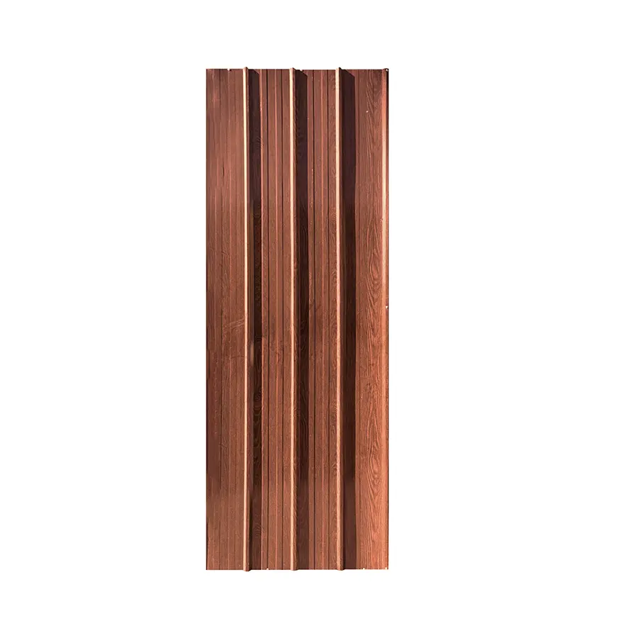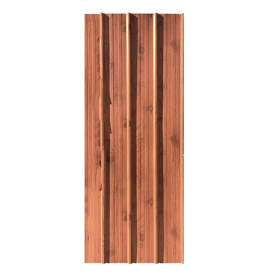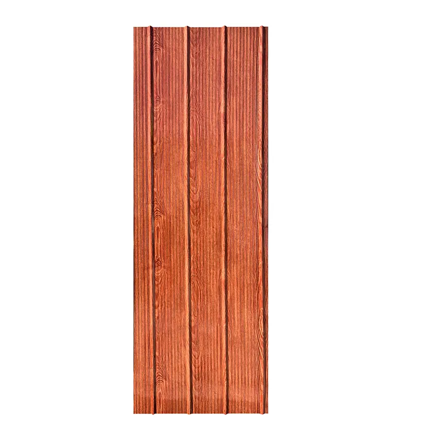 Plancha de zinc con acabado que imita madera, de tonos cálidos rojizos y vetas verticales que le dan un aspecto rústico y uniforme.