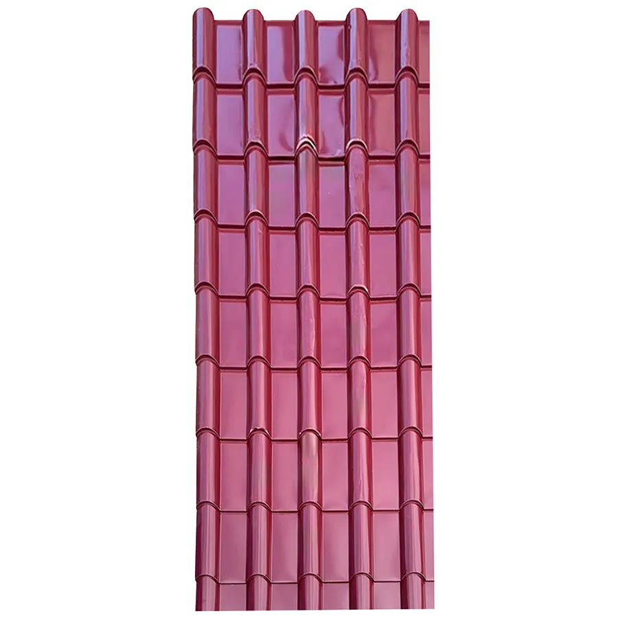 Teja colonial de zinc color burdeo, con un acabado brillante y acanalado que imita la teja tradicional. Aporta un look elegante moderno y resistente.