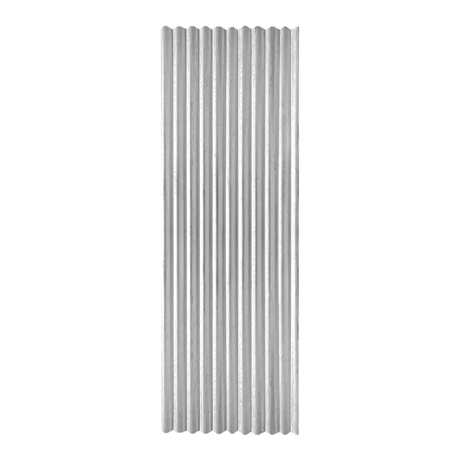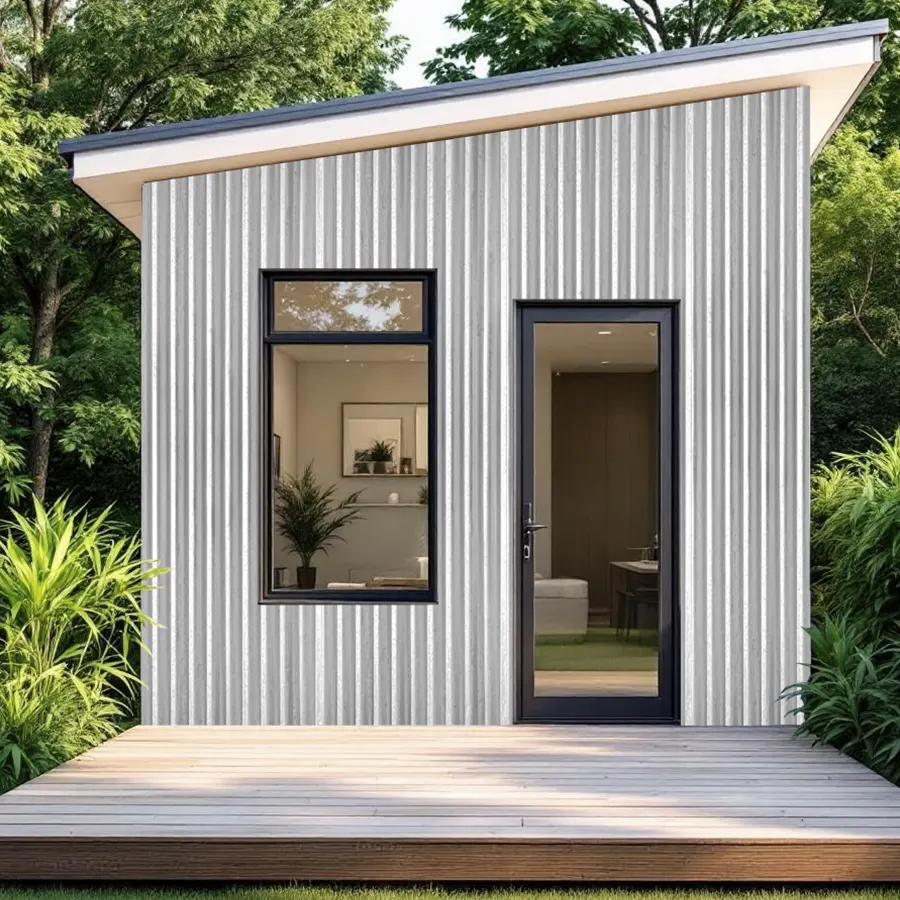 Plancha de zinc acanalada en tono gris, con relieves verticales que le dan un aspecto industrial e iluminado. Uso para muros y techos.