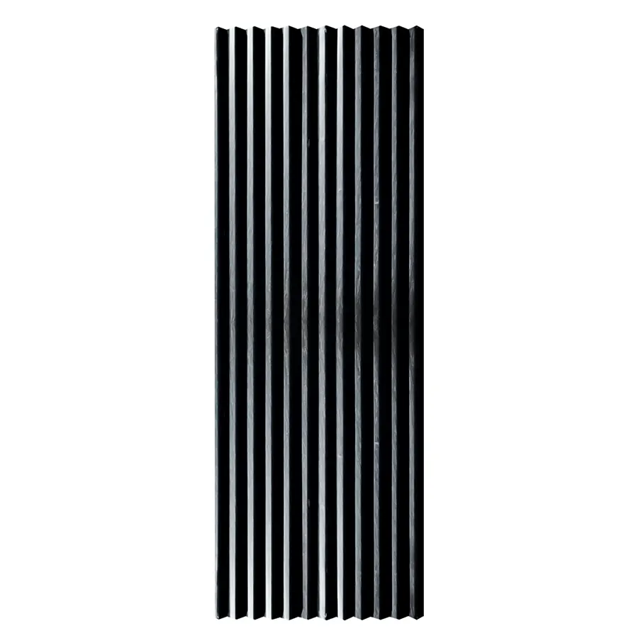 Plancha de zinc acanalada en tono negro, con relieves verticales que le dan un aspecto industrial y sobrio. Uso para muros y techos.